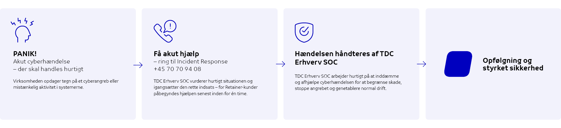 I får direkte adgang til TDC Erhvervs IR-specialister, som er klar til at handle døgnet rundt – hvor vi sikrer, at hjælpen igangsættes senest 1 time efter et angreb er konstateret.